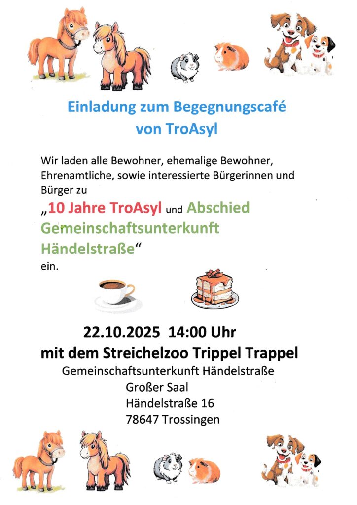 Einladung zum Begegnungscafé und Streichelzoo9. Oktober 2025AllgemeinWir feiern 10 Jahre TroAsyl und nehmen Abschied von der Gemeinschaftsunterkunft in der Händelstraße.Teilen Sie dies Twitter Facebook Pinterest Frühere Beiträge FerienspaßAuch in den Sommerferien haben die Kinder in der Gemeinschaftsunterkunft viel Spaß beim Spielen und… Kooperationsprojekt mit Stiftung LiebenauGisela Forn (TroAsyl), Tanja Herter (Sozialdienst für Flüchtlinge) und Isabel Krichel-Bonstein (Stiftung Liebenau) starteten Ende… Streichelzoo beim BegegnungscaféAm 2. Juli 2025 war die Begeisterung in der Gemeinschaftsunterkunft groß: Die Kinder hatten Riesenspaß…